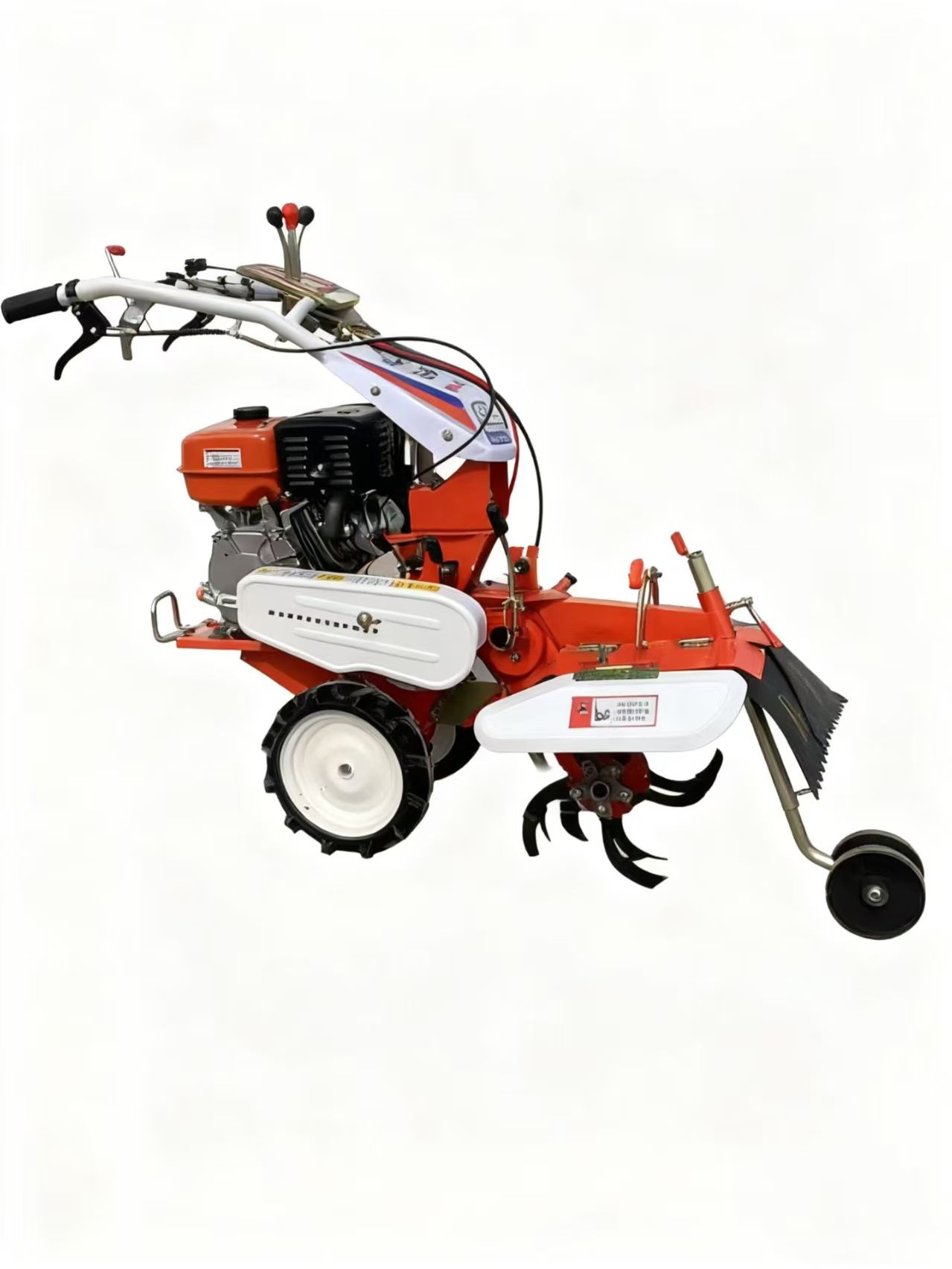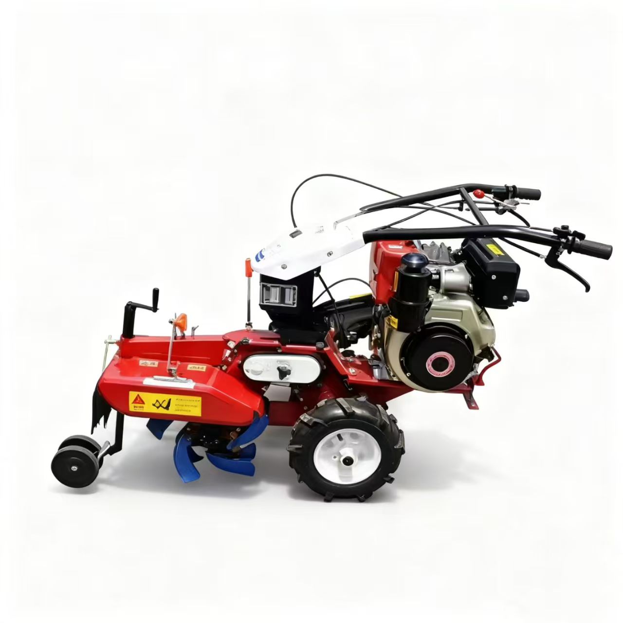 - เฟรมและส่วนควบคุม: เฟรมเหล็กน้ำหนักเบาพร้อมแฮนด์แบบพับได้ แฮนด์รถมีคันเร่ง คลัตช์ และคันเกียร์ในตัว ช่วยให้ควบคุมได้ด้วยมือเดียวเพื่อให้เคลื่อนที่ระหว่างแถวพืชที่แคบได้อย่างง่ายดาย